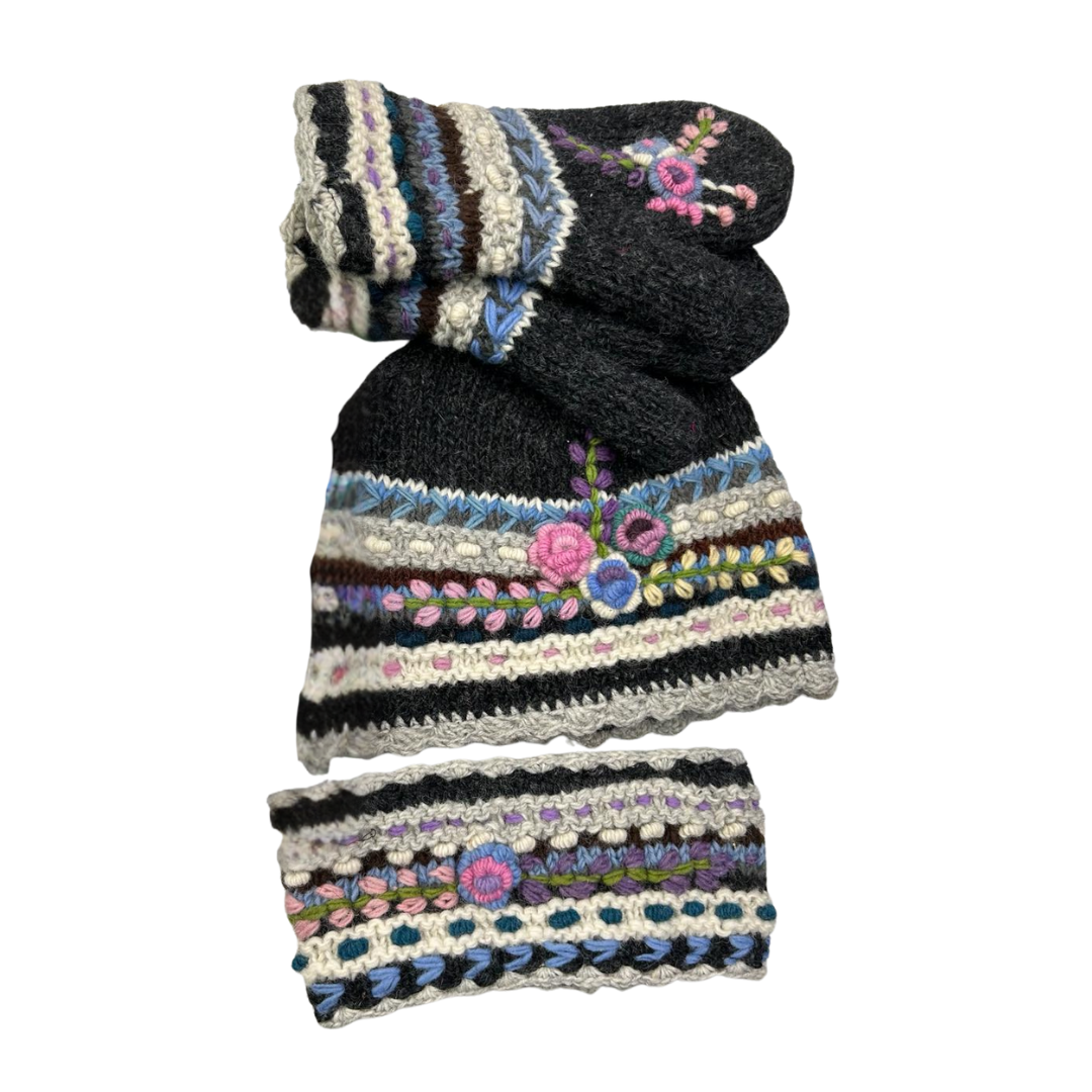 Kauniilla brodeerauksilla koristeltu neulottu pipo, lapaset ja pipo.