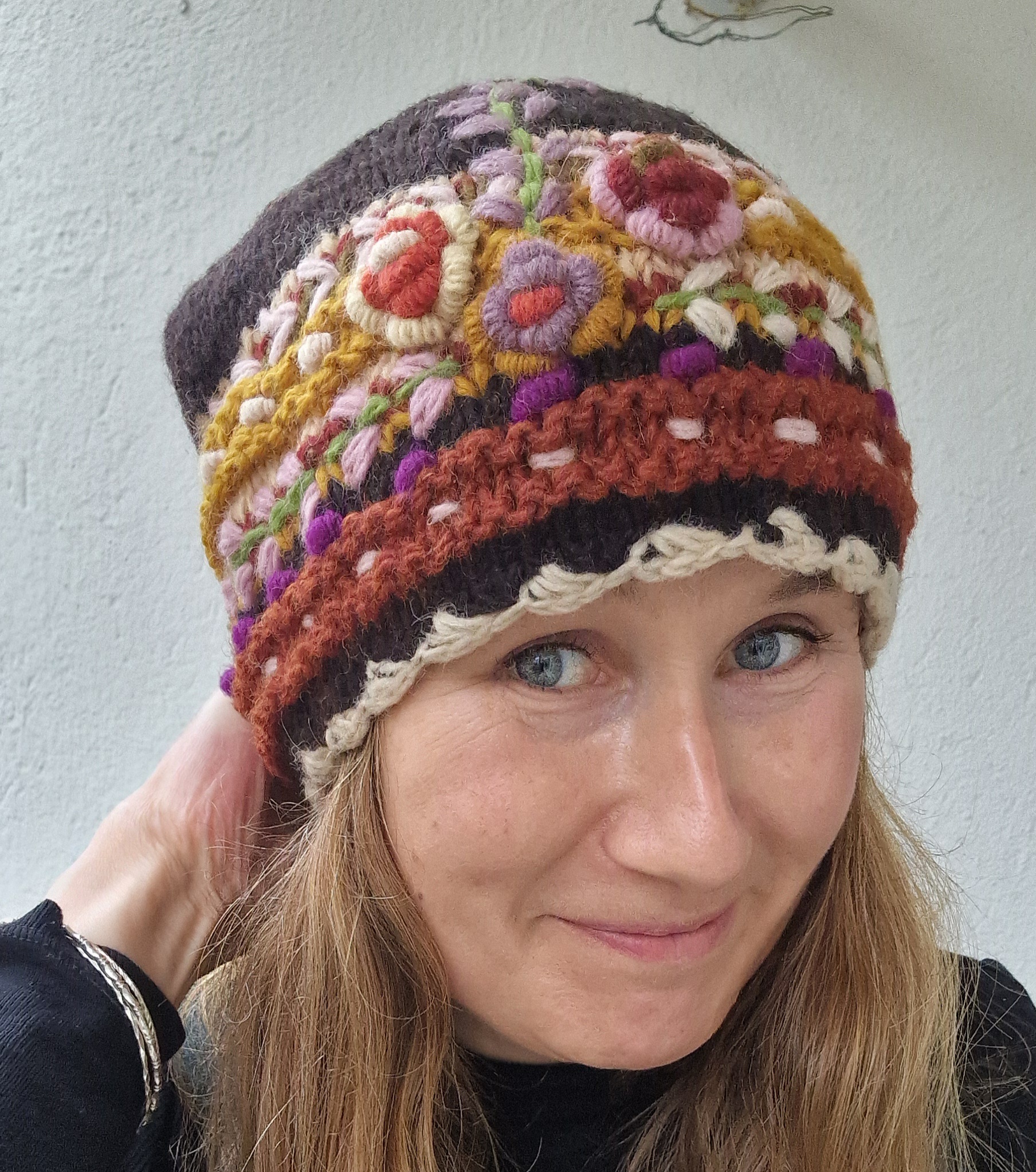 Näyttävillä kukkakirjailuilla koristeltu villapipo.
