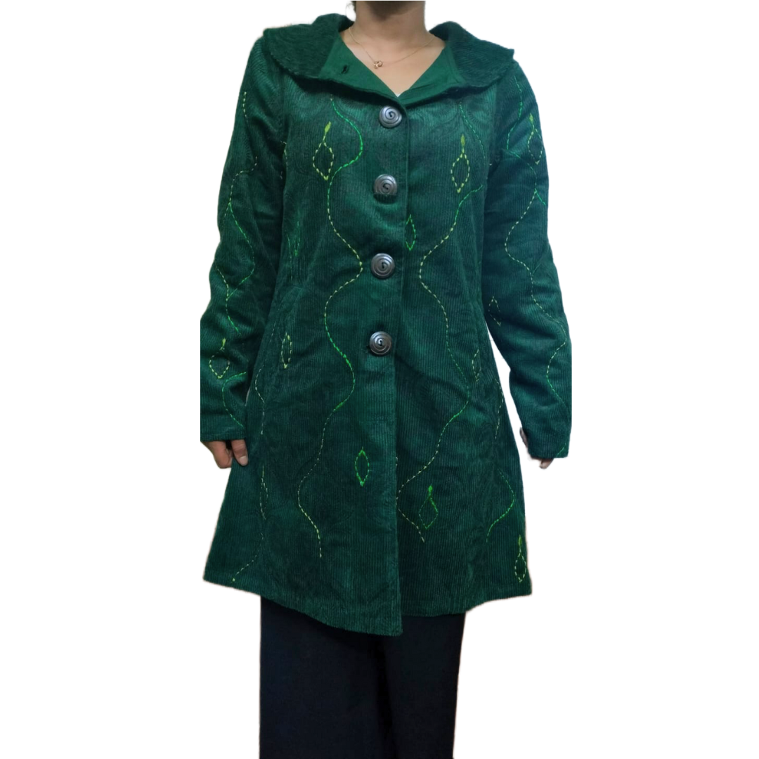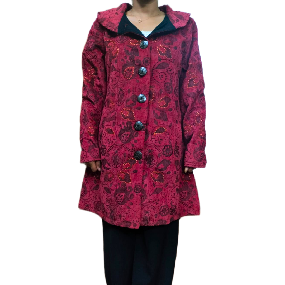 Pitkä vakosamettitakki brodeerauksilla. Puuvillavuori.